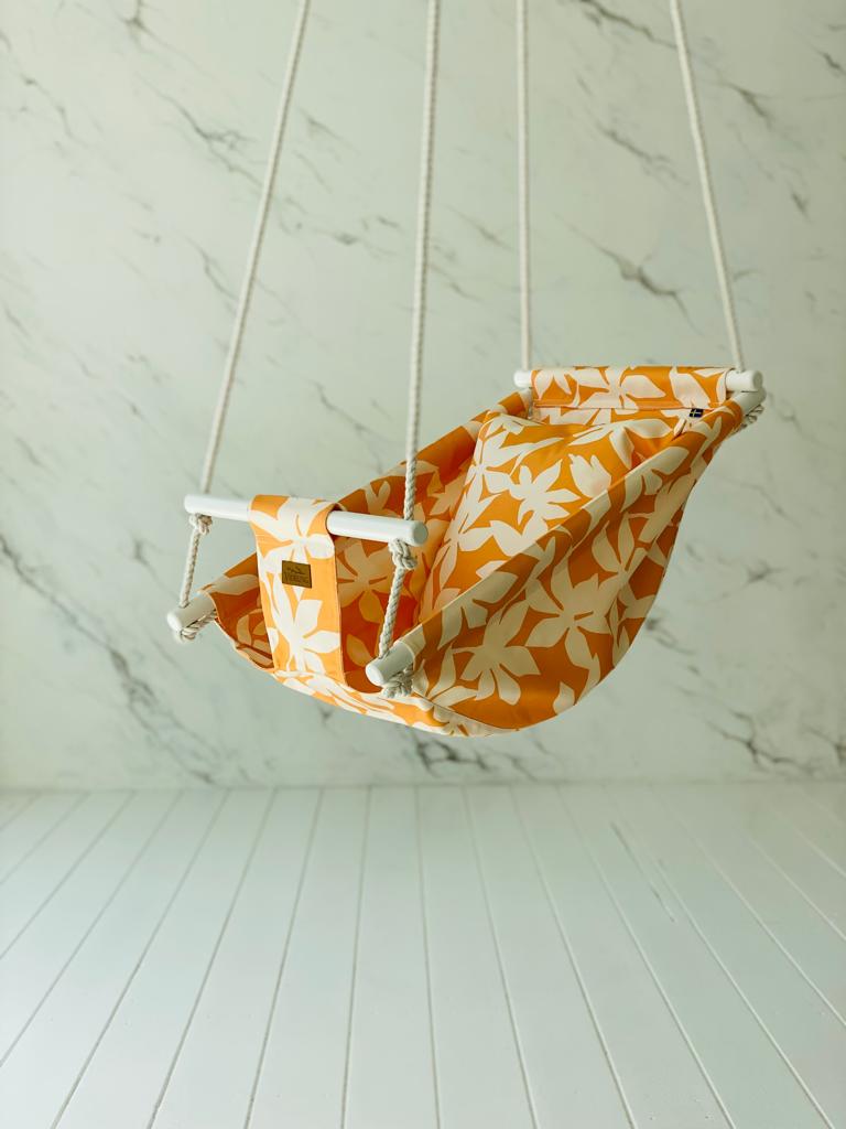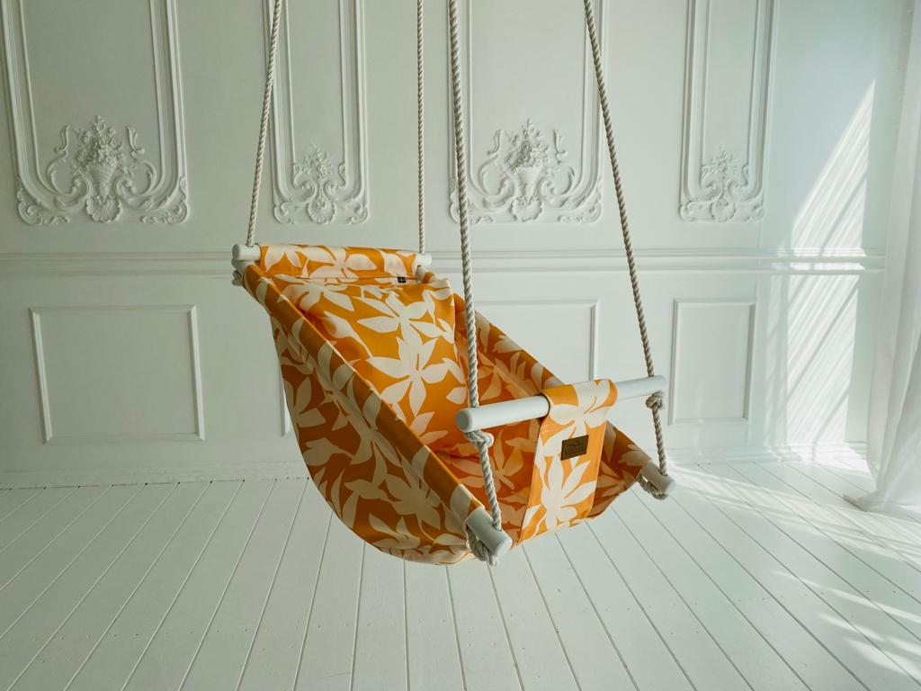 Babygunga Höstvärme från Videung för barn från 3 månader upp till 3 år. En Höstvärme babygunga bjuder på varma gula toner. Babygungan är reglerbar från liggande till sittande. En Höstvärme babygunga passar utmärkt som doppresent.